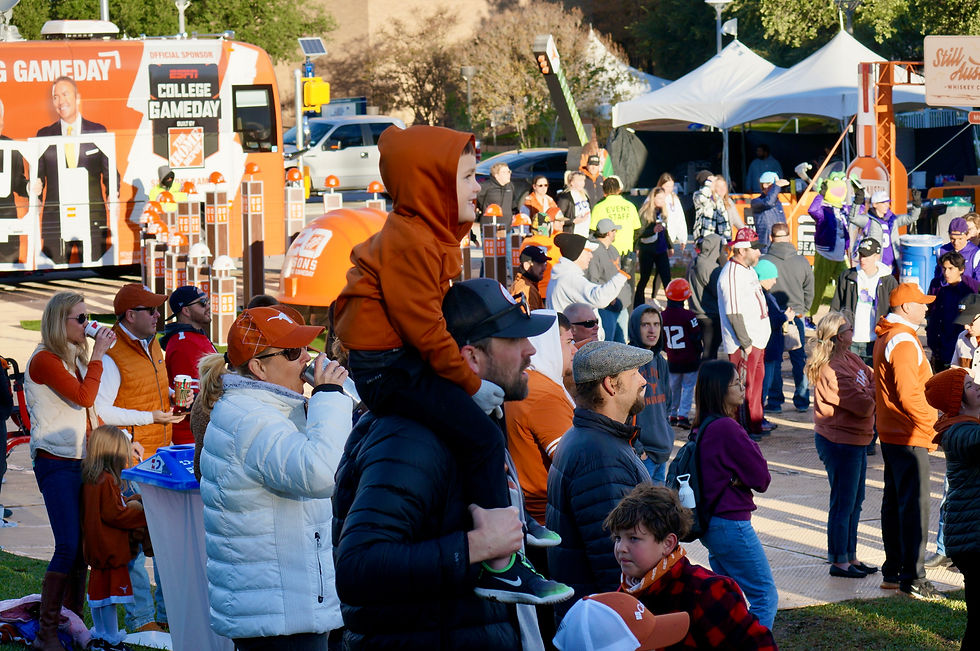 The Fans at Longhorn's ESPN GAMEDAY2244 OnlineNov 13, 20221 min readCollege Football-Hookem little guySki GogglemanToddler Boy enjoys the view from his seat on daddy's shouldersMirin' best dressed longhorn overalls and cowboy hat