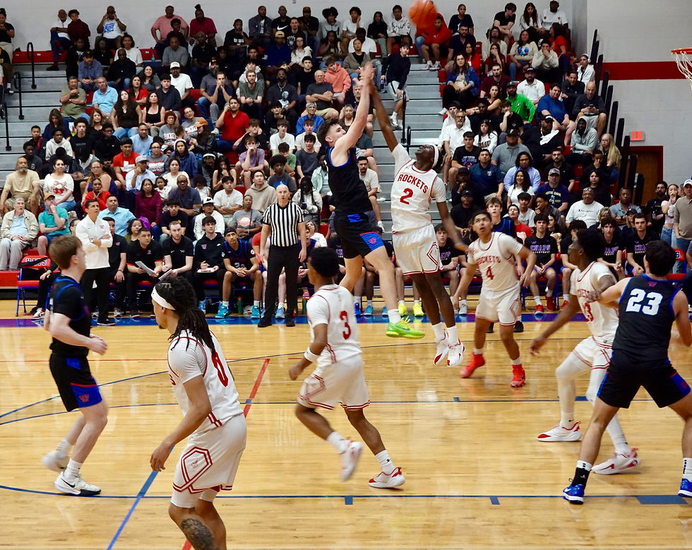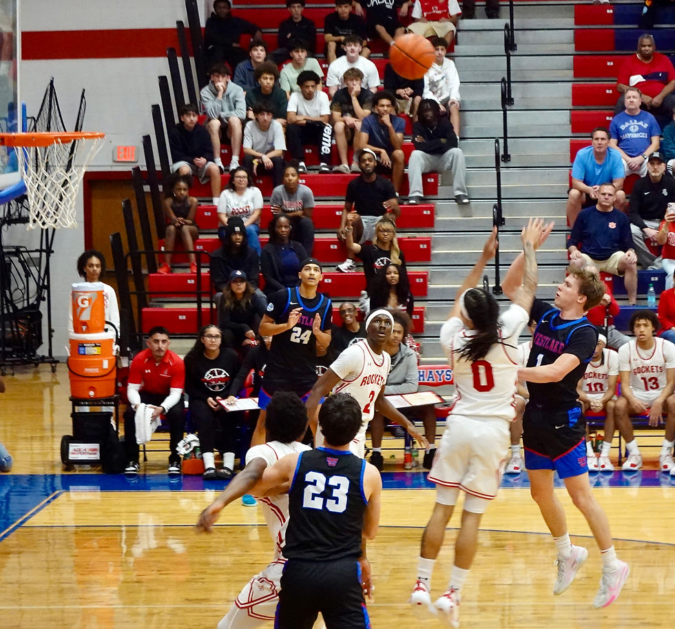 Texas 6A High School Basketball-Hays High School, Bales Gym, Buda, Texas, Friday evening March 6th 2026. Above Westlake #5 Bo Ogden controls the opening tip from Judson #23 Franklin Ihama. Westlake jumped out early 12-4 which narrowed to 12-7 after the first quarter. Score by Quarter Westlake 12-7, 24-19, 38-32 and 49-46 for the final. Westlake by virtue of the Regional victory advances to the State "Final Four." See more images below.