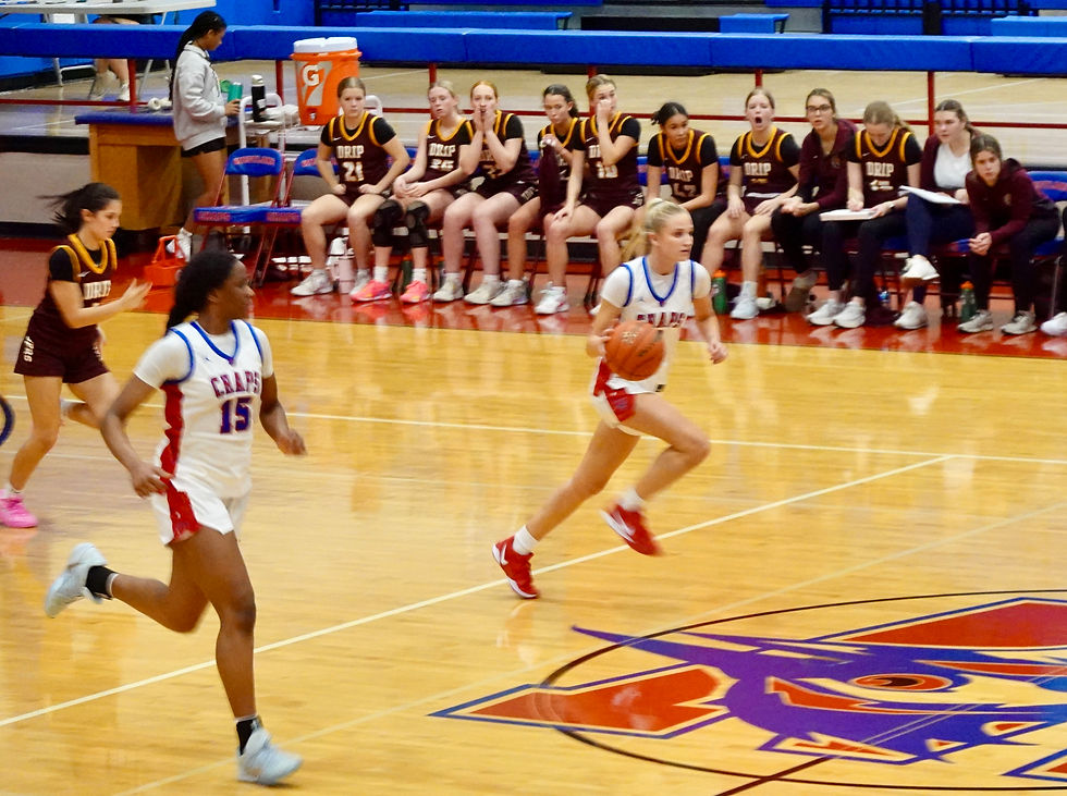 Texas Girls 6A High School Basketball-West Lake Hills, Texas-Friday evening January 16th 2026. Westlake entered the game against visiting Dripping Springs 5-0 in conference, 28-0 overall, ranked #1 in Texas and #16 in America. Dripping Springs was 2-3 in conference and 17-5 overall and ranked #308 in Texas. Westlake jumped out early. Score by Quarter Westlake 20-7, 36-13, 60-24 and 71-32. Image above #0 Molly Frazer on the break passing to #15 Tamia King. See many images below.